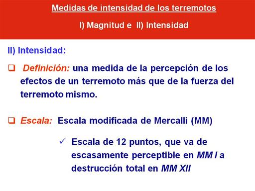 Categorías de la Escala Modificada de Mercalli (MM): I. Percibido por pocas personas, en circunstancias muy favorables II. Percibido por pocas personas en descanso, especialmente en pisos superiores de edificios. Objetos suspendidos pueden oscilar. III. Percibido notablemente en interiores. Vehículos de motor estacionados pueden moverse ligeramente. Vibración como se percibe al paso de un camión de carga. IV. Percibido en interiores por muchos, en exteriores por pocos. Si es de noche, algunos se despiertan. Loza, cristalería, ventanas, puertas se agitan y tintinean o crujen. V. Percibido por casi todos; daños a contenidos y estructuras no es común pero puede ocurrir. VI. Percibido por todos; muchos se atemorizan y salen al exterior; leves daños. VII. Todos corren a exteriores; daño mínimos a edificios diseñados y construidos adecuadamente para sismos; leves a moderados en edificaciones ordinarias; daños considerables en estructuras pobres o malamente diseñados. VIII. Daños leves en bien diseñados; considerables en ordinarios y mayores en estructuras pobremente construidas; chimeneas, monumentos, paredes, etc., caen. IX. Daño considerable a estructuras bien diseñadas, y grande (incluido colapso parcial o total) en otros edificios; los edificios son arrancados de sus cimientos; las líneas subterráneas son rotas. X. Algunas estructuras bien construidas de madera son destruidas; la mayoría de estructuras ordinarias y de mampostería son destruidas; las vías ferrocarrileras son afectadas, derrumbes son comunes; derrames de agua de ríos o lagos, etc. XI. Pocos, si algunos, edificios de mampostería permaneces de pié; puentes son destruidos; se abren grietas amplias en la tierra; las líneas subterráneas están totalmente fuera de servicio; desaparece tierra. XII. Daño total; las ondas se ven en la superficie de la tierra; casi imposible estar de pié; los objetos vuelan en el aire.