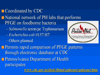 The Supercourse has a series of lecture from the CDC including the lecture by Jeff Koplan. Pulsenet is described at