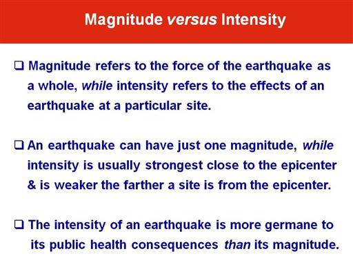 “The intensity is assigned for a particular location on the basis of the visible consequences left by the earthquake and from subjective reports by people who experience the shaking.
