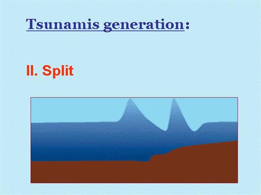 “II. Split: Within several minutes of the earthquake, the initial tsunami is split into a tsunami that travels out to the deep ocean (distant tsunami) and another tsunami that travels towards the nearby coast (local tsunami). The height above mean sea level of the two oppositely traveling tsunamis is approximately half that of the original tsunami. (This is somewhat modified in three dimensions, but the same idea holds.) The speed at which both tsunamis travel varies as the square root of the water depth. Therefore the deep-ocean tsunami travels faster than the local tsunami near shore.”