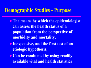 studies : 1. Focus on the occurrence of disease in populations; Vs. those epidemiologic studies which concentrate on the occurrence of disease among individuals in relation to possible risk factors; 2. Search for associations between disease frequency and the presence or absence of possible etiologic agents in those populations; 3. Address issues as to whether a disease is increasing or decreasing in the population, and whether a disease occurs more often in populations that have greater exposure to a potential cause. |