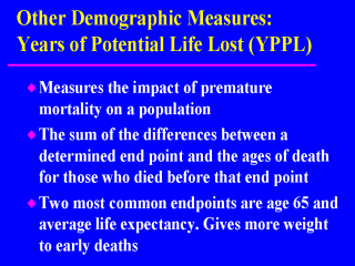 below average life expectancy). Should be used to compare premature mortality in different populations since YPLL does not account for differences in population sizes. |