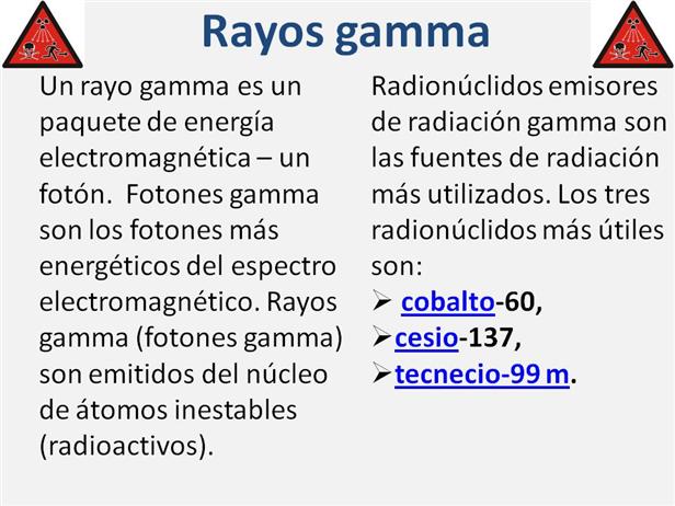 l poder de los rayos gamma es penetrante y tienen capacidad para recorrer grandes distancias, se considera el peligro principal para la población en general en situaciones de emergencia radiológica. De hecho, cuando el término "enfermedad de la radiación" se utiliza para describir los efectos de los grandes riesgos de cortos períodos de tiempo, los daños más graves son resultado, casi con toda seguridad de la radiación gamma.