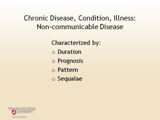While there are some subtle differences between the terms chronic conditions, chronic diseases, and chronic illnesses. In this presentation, we will be using them interchangeably and they will indicate a condition as described above that can be characterized by pattern, prognosis, duration, and sequalae. Chronic conditions & diseases are also known as non-communicable diseases (NCD).