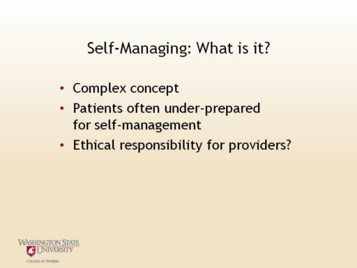 Self-management is a complex concept that is not consistently defined or interpreted. It’s interpretation varies depending on philosophic, societal, and cultural norms and values. Self management is generally used in the context of discussing the self care people engage in for their chronic conditions. Further, there is the assumption that the self-care associated with the term “self-management” is based on patients’ making decisions and implementing behaviors based on some knowledge of their condition and their providers’ treatment recommendations.