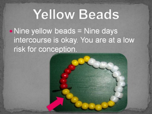 Nine yellow beads = Nine days intercourse is okay. You are at a low risk for conception.