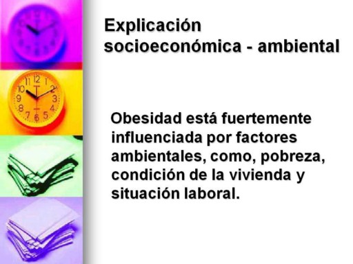 Un rango de factores económicos complejos, ambientales, sociales y culturales tienen un rol en el aumento de la obesidad como problema de salud. No solo considera el impacto de la posición social, origen étnico y género en la prevalencia de obesidad, pero también involucra el examen de las implicaciones del desempleo, de la pobreza sobre la salud y el bienestar de niños y adultos. |