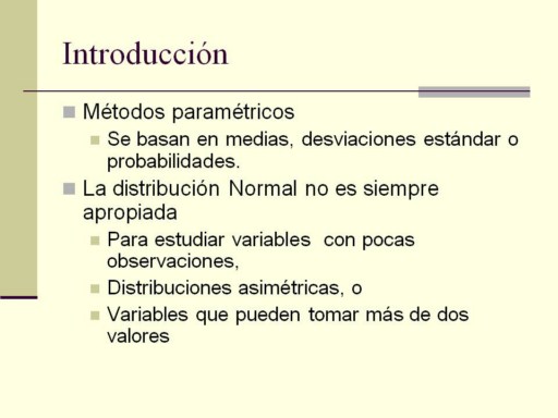 Hasta ahora, hemos utilizado métodos que suponen que la variable tiene una distribución con algunas características: a) la distribución es Normal, para datos cuantitativos, y b) para datos binarios, la distribución es binomial, con una probabilidad, p. Las medias, desviaciones estándare4s y probabilidades, son llamados parámetros y los métodos que hacen suposiciones acerca de esos parámetros, se llaman métodos paramétricos. Existen otras distribuciones, en las que no se asume que sean Normales o binomiales, como cuando el tamaño de muestra es pequeño, los datos cuantitativos no tienen una distribución Normal o cuando los datos categóricos tienen más de dos valores.