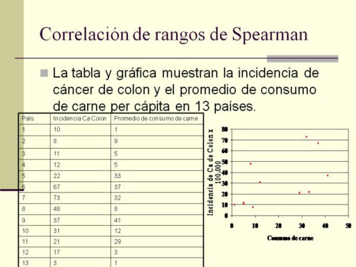 Ya sabemos que podemos medir la correlación entre dos variables numéricas, usando la correlación r de Pearson. Para la relación entre consumo de carne e incidencia de cáncer de colon es r=0.65. Pero las variables deben tener una distribución Normal. Cuando no son Normales, podemos aplicar dos estrategias: 1.- Transformar las variables (logarítmica o elevarlas al cuadrado), para volverlas más Normales, o 2.-Usar el equivalente no paramétrico