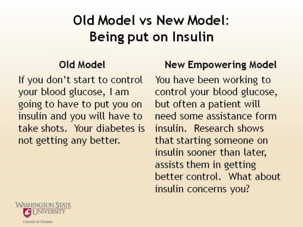 In the old model, the provider just assumes, the patient is not doing anything to control their blood glucose and uses insulin as a threat.