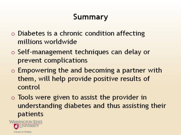 By providing healthcare providers with the knowledge of diabetes and its complications and treatments, they can then partner with the patient and assist them in gaining the knowledge they need to take control of their diabetes. |