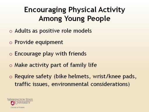 -Adults can set positive examples by leading active lifestyles (Parents influence their children’s beliefs, attitudes, and behaviors towards physical activity. Parents and influential adults can positively influence young peoples activity behaviors). Discuss the positives associated with p.a. with children, share positive experiences, encourage involvement. -Incorporate activities into part of family life (family walks, hiking, playing active games together) -Provide equipment for physical activity or take young people to areas encouraging activities (parks, open space, community areas, hiking trails, etc.) -Talk positively about physical activity, encourage participation, make activities enjoyable. -Encourage less time with technology and more time being active. -Encourage activity with friends and/or neighbors (hide and seek, tag, walks, bike riding, play |