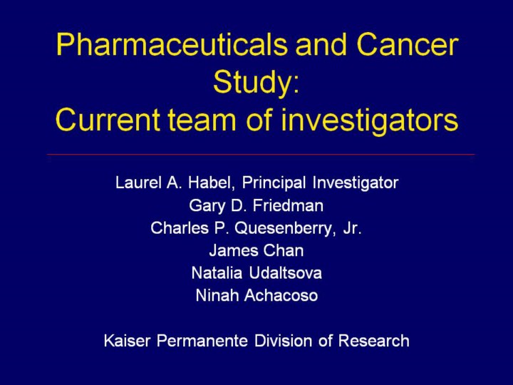 Drs. Habel and Friedman are epidemiologists, Dr. Quesenberry is a biostatistician, Dr. Chan is a pharmaceutical scientist, and Dr. Udaltsova and Ms. Achacoso are programmer/analysts. |