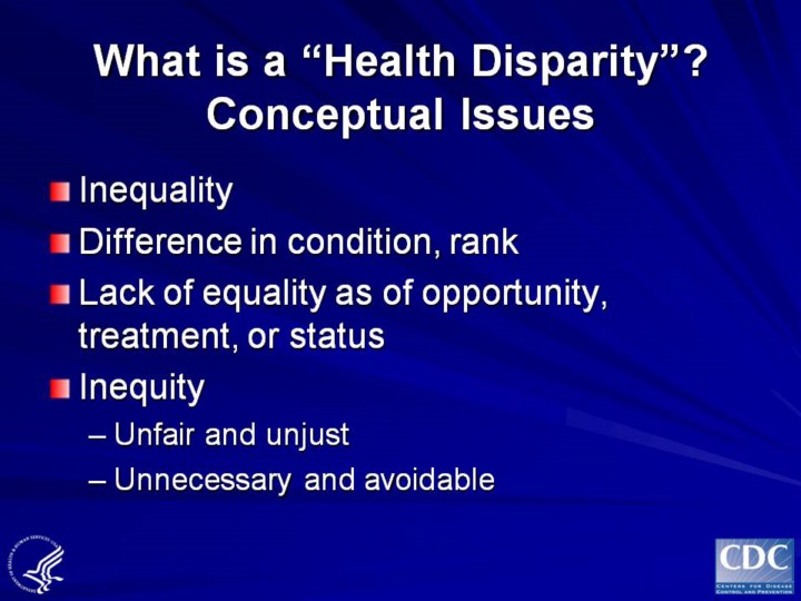 First, let me define, “Health Disparity” and discuss some conceptual issues. Most dictionaries define “disparity” as: inequality; difference in age, rank, condition. .. Disparity and difference are synonyms in most dictionaries. Inequality is defined as: lack of equality as of opportunity, treatment or status. Inequity, though, signifies an ethical judgment, an instance of unfairness or unjustness. Another level is added if one includes a judgment of what is unnecessary and avoidable. There are disagreements regarding the definition and use of the terms “disparity”, “inequality”, and “inequity”. These disagreements center on which term to use, whether a judgment of what is avoidable and unfair is included, and how these judgments are made. These conflicting views have implications for resource allocation and reflect different political ideologies. Decisions regarding what is avoidable and unjust are not simple, but are based upon what we currently know, are political decisions based on resources and ideology, who is deciding what is avoidable and unjust, and how it is decided. For example, if you start with the premise that health is solely an individual’s responsibility, then you will not consider other factors that are amenable to intervention. In the context of public health and social science, “Disparity” has begun to take on the implication of injustice, but still may be distinguished from the general term “inequality.” Conceptually, a “health disparity” could be viewed as a chain of events signified by a difference in: 1) health status; 2) a particular health outcome that deserves scrutiny; 3) access to, utilization of, and quality of care; or 4) environment. Such a difference should be evaluated in terms of both inequality and inequity, since what is unequal is not necessarily inequitable.