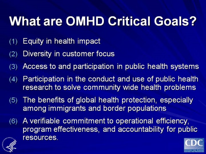 What are OMHD Critical Goals? OMHD’s goals derive from the strategic imperatives and address CDC’s need to achieve health impact for at-risk populations: