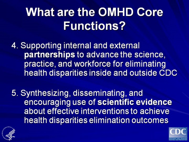 What are the OMHD Core Functions? 4. Supporting internal and external partnerships to advance the science, practice, and workforce for eliminating health disparities inside and outside CDC -- Maintaining critical linkages with federal partners including OS/HHS and representing CDC on related scientific and policy committees -- Establishing external advisory capacity and internal advisory and action capacity -- Coordinating CDC-wide minority health and health disparities elimination initiatives