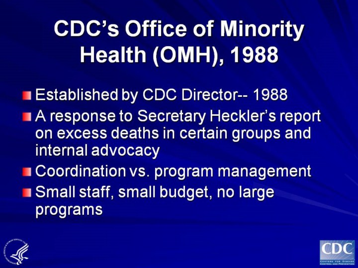 The DHHS “Office of Minority Health” was established following release of the report, to manage implementation of the report’s recommendations. CDC’s OMH was established in 1988, in response to the Heckler report and internal advocacy for a minority health office at CDC.