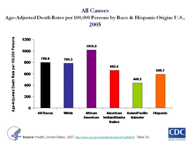 Updated 6/2/08 by SB. Age-Adjusted Death Rates per 100,000 Persons by Race and Hispanic Origin for All Causes: U.S., 2002 Compelling evidence that race and ethnicity correlate with persistent, and often increasing, health disparities among U.S. populations demands national attention. Indeed, despite notable progress in the overall health of the Nation, there are continuing disparities in the burden of illness and death experienced by African Americans, Hispanics/Latinos, American Indians and Alaska Natives (AI/ANs), and Native Hawaiian and Other Pacific Islanders (NHOPIs), compared to the U.S. population as a whole. Current information about the biologic and genetic characteristics of minority populations does not explain the health disparities experienced by these groups compared with the white, non-Hispanic population in the United States. These disparities are believed to be the result of the complex interaction among genetic variations, environmental factors, and specific health behaviors. (1)