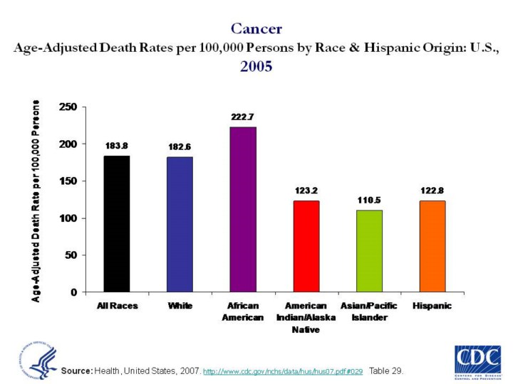 Updated 6/2/08 by SB. Age-Adjusted Death Rates per 100,000 Persons by Race and Hispanic Origin for All Causes: U.S., 2002 Compelling evidence that race and ethnicity correlate with persistent, and often increasing, health disparities among U.S. populations demands national attention. Indeed, despite notable progress in the overall health of the Nation, there are continuing disparities in the burden of illness and death experienced by African Americans, Hispanics/Latinos, American Indians and Alaska Natives (AI/ANs), and Native Hawaiian and Other Pacific Islanders (NHOPIs), compared to the U.S. population as a whole. Current information about the biologic and genetic characteristics of minority populations does not explain the health disparities experienced by these groups compared with the white, non-Hispanic population in the United States. These disparities are believed to be the result of the complex interaction among genetic variations, environmental factors, and specific health behaviors. (1)
