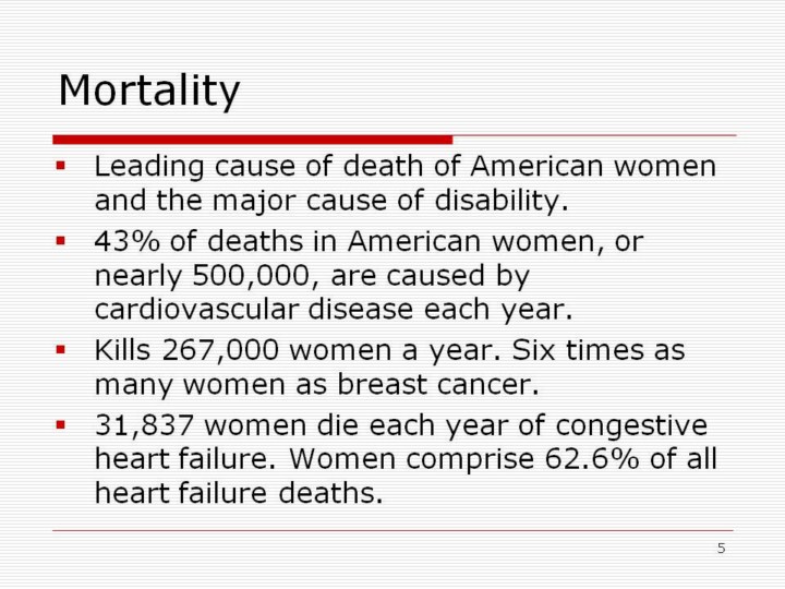 Mortality: Heart disease is the leading cause of death and disability for American women . Heart Disease and stroke together cause of 43% of deaths among American women every year. (this represents a half million women) Heart attack alone causes two hundred sixty seven thousand (267,000) deaths and 31, 837 women die each year of congestive heart failure. Women make up nearly 2/3 of all heart failure deaths. A woman’s risk of dying from heart disease is six times greater than her risk of dying of breast cancer. |