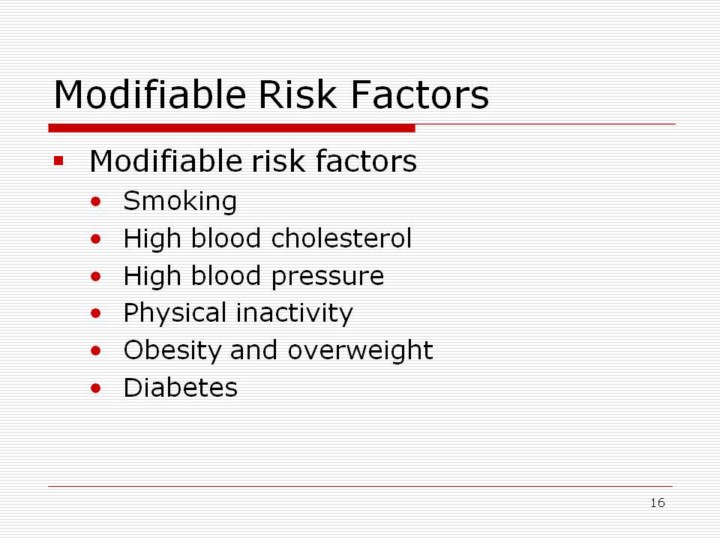 Many risk factors can be modified, treated or controlled by focusing on lifestyle habits and taking medicine, if needed. According to Dr. Richard Pasternak, director of preventive cardiology at Massachusetts General Hospital in Boston "There is compelling evidence from studies and clinical trials that coronary heart disease is largely preventable.“ Modifiable risk factors include: Smoking High blood cholesterol High blood pressure Physical inactivity Obesity and overweight Diabetes