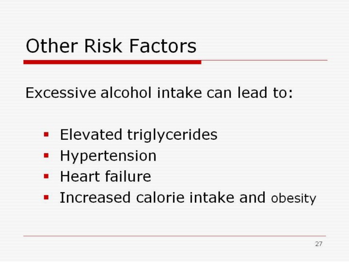 Another risk factor for heart disease is excessive alcohol intake — The risk of heart disease in people who drink moderate amounts of alcohol (an average of one drink for women per day) is lower than in nondrinkers. However, it's not recommended that nondrinkers start using alcohol or increase the amount they drink. Excessive drinking and binge drinking can contribute to obesity, high triglycerides, cancer and other diseases, raise blood pressure, cause heart failure and lead to stroke. Pregnant women should not drink alcohol in any form.