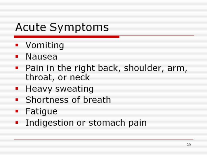 Women may have some or none of the common acute symptoms during a heart attack. Vomiting Nausea Pain in the right back, shoulder, arm, throat, or neck Heavy sweating Shortness of breath Fatigue Indigestion or stomach pain
