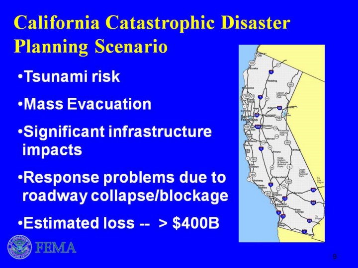 The State of California is a highly prepared and capable “at-risk” State with a history of severe earthquake and related seismic activity. It has a highly diverse and important economy, a highly diverse and heterogeneous population, and includes a demographic with large special needs populations. California’s unique geography is a peninsula with severe geographic restrictions on transportation, evacuation, and logistics, a highly sensitive environment and ecology, and demanding climate and weather conditions complicated by the likelihood of secondary incidents and consequences such as landslides. Continue on with points on Slide 18… The area potentially affected by a major earthquake is projected to be 75% larger than the 90,000 square miles affected by Hurricanes KATRINA and RITA. The region houses and supports a significant number of critical infrastructures vital to national and homeland security and, as with the NMSZ, the resident infrastructure topologies and dependencies have wide-ranging impact on other regions. |