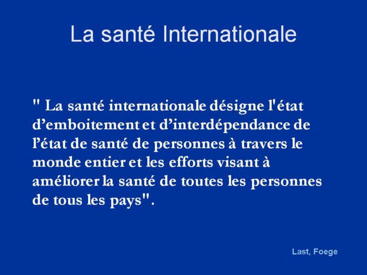 La santé internationale ne peut être considérée comme spécifique d’une maladie ou d’un pays. Nous devons examiner toutes les conditions transfrontières et transdisciplinaires qui influent sur la santé. Le mot “international” est littéralement défini en termes de frontières nationales, alors que le mot “global” ou “mondial” englobe le monde entier.