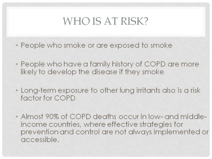 Most people who have COPD are at least 40 years old when symptoms begin. Although uncommon, people younger than 40 can have COPD. For example, this may happen if a person has alpha-1 antitrypsin deficiency, a genetic condition.