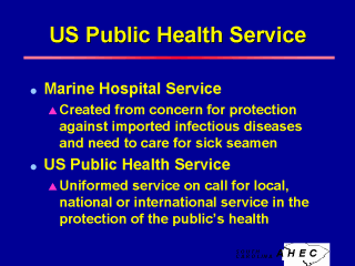 At the outset of our nation, concern for protection against imported infectious diseases and the need to care for sick seamen led to the creation of the Marine Hospital Service (MHS). The MHS was the predecessor of today’s US Public Health Service (USPHS), a uniformed service of health professionals on call for local, national or international service in the protection of the public’s health. The U.S. Public Health Service Commissioned Corps continues to provide a wide range of services, from staffing Indian Health Service facilities to international epidemic response teams. The chief of the USPHS is the Surgeon General and Assistant
