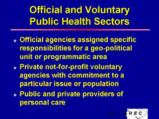 Components of the Official and Voluntary Public Health Sectors The network that promotes the health of populations includes official agencies assigned specific responsibilities for a geo-political unit or programmatic area AND private non-for-profit voluntary agencies with a commitment to a particular issue or population. Public and private providers of personal care also contribute to the effort. Emphasize the breadth and flexibility of this network. One good example of the inter-relationship is from the 1993 E.coli 0 157 outbreak in Washington State caused by undercooked hamburgers sold by a fast food chain. The outbreak was first suspected by pediatric emergency care providers and hospital laboratories, confirmed by state and local public health laboratories and epidemiologists. The fact that there were so few deaths was due to the outstanding performance of the care system, using the current best practices for aggressive disease management. The fact that there were so few second-generation cases (those caused by exposure to people who got the disease from the first source) was due to an outstanding effort to educate anyone providing child care services in the affected communities. The entire episode led to revision of food handling regulations for ground beef, and increased cooking time requirements to minimize chances of disease transmission. This episode also provided part of the impetus for the new USDA meat inspection rules. |