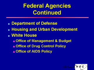 DOD provides both personal care and population health services to all military personnel; laboratories and researchers often collaborate with CDC and other HHS agencies. HUD supports programs for the homeless, including some health services, and works to assure safe housing for all. White House - Office of Management and Budget oversees all federal Executive Branch funding, sometimes limiting what agencies may do. - Office of National Drug Control Policy (ONDPC) coordinates HHS with Drug Enforcement Agency and others, and sets the tone for national efforts. The current fascination with controlling the drug supply has limited the amount of attention given to care and prevention. - Office of National AIDS Policy coordinates across all agencies and provides a national voice on the epidemic. It has been over-ruled by ONDPC on syringe and needle exchange programs as a prevention measure, despite good research evidence to support the program. |
