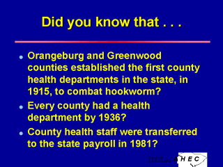 The structure of public health agencies varies across counties and around the nation. Some are integrated into a single statewide structure, as is the case in South Carolina. In other parts of the country, local governments are obliged to establish local public health authorities that then work (with varying degrees of legal responsibility and budget support) with the state health authority. There are some states in which there is no identifiable local public health authority, with any services that exist coming from a single state agency that may have some regional offices. While there is no absolute recipe for success, the Institute of Medicine’s 1988 report on public health suggested that we need, in any model, national leadership, state structure, and a local presence. |
