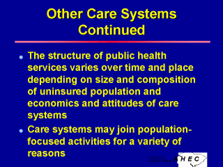 Community decision-making is a critical ingredient in assuring that all segments of the population are included in care. The exact mix of public and private systems may vary from place to place, or in the same place over time, or at the same time for different segments of the population. The interests of the care system may include altruism and enlightened self-interest (community visibility, potential market share). From a public health perspective, the incentives to support personal care programming vary depending on the population threat posed by failure to assure care. That is, most health departments will provide treatment/care services for tuberculosis and sexually transmitted diseases, and the personal care service of immunizations. They have been less likely to provide care for chronic, non-communicable diseases of adults such as cancer or heart disease. An intermediate position is occupied by services associated with reproductive health, pregnancy and early childhood. |