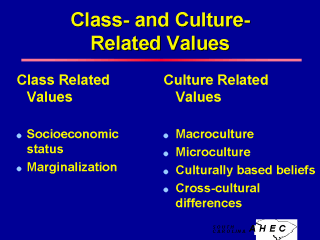 | Class-Related Values: - Class is a category of division based on socioeconomic status. Members of a class are theoretically assumed to possess similar cultural, political and economic standards and principles. - Individuals belonging to lower socioeconomic groups tend to be marginalized and are under-represented in the shaping of the cultural norms of a community. Culture-Related Values: - Macro-cultures include national, ethnic, or racial groups; micro-cultures include gender, age, religious beliefs and other factors that determine roles, behaviors and values. Both combine to shape an individual’s world view and influence their interaction with others. - Culturally based beliefs and traditions can affect the course and outcome of disease. Health care providers constitute a culture with a distinct system of values, beliefs, and learned patterns of behavior. Patients and health care providers both bring their respective cultural backgrounds and expectations to the medical interview. Cross-cultural differences can introduce obstacles to delivery of appropriate care. Eg.: - The Western emphasis on the individual may limit the understanding of the central role that family plays in managing illness in many other cultures. - Western medicine characterizes disease on a biological or pathological basis, whereas in some cultures, the concept of illness is patient-centered and more subjective. |