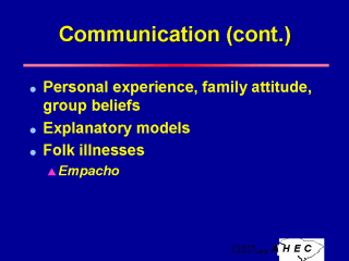 eating at the wrong time. In infants, empacho is thought to be caused when too much saliva is swallowed during teething, when formulas are changed, or when infants are switched from formula to milk. Symptoms include nausea, stomach cramping, stomach ache, appetite loss, bloated abdomen, and diarrhea. Treatment regimens vary widely among Latino cultures. Puerto Rican-Americans consult a special healer called a santiguadora, and Mexican-Americans see a sobadora. Both healers rely on a combination of special massage, prayers and dietary modification to alleviate symptoms. Biomedicine characterizes empacho as a mild self-limiting illness, but Latino parents believe in the existence of empacho as an illness and make health care decisions based on that belief. Knowing that the folk treatment is neither harmful nor dangerous, the health care provider should be respectful of the parent’s beliefs and either agree to work with the folk healer or refer the parents to one in the community. |