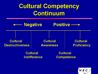 | Cultural Competency Continuum Going from negative to positive (left to right): - Cultural Destructiveness: Behaviors, attitudes and policies that are destructive to a culture and its members. Examples include racism, stereotyping, collusion, and exclusionary practices. - Cultural Indifference: Behaviors, attitudes and policies that are ignorant of or indifferent to the importance of cultural diversity and the impact of culture on health and health care. - Cultural Awareness: Behaviors, attitudes and policies that begin to demonstrate sensitivity to cultural differences, acknowledge disparities, and refrain from making value judgements. Builds understanding of assumptions and values upon which and individual’s behavior and world view rest. Includes cultural self-awareness as the basis for accepting other cultural beliefs and values. - Cultural Competence: The life-long commitment to developing the beliefs, attitudes, values, skills and policies necessary to respond with respect and empathy to people of all cultures, races, religions, and ethnic backgrounds in a manner that recognizes, affirms, and values the worth of the individual, family, and community. In the health care setting, cultural competence implies the ability to effectively intervene with patients to participate in creating positive health outcomes. - Cultural Proficiency: Advanced cultural competence demonstrated by participation in research to add to the body of knowledge, develop new approaches and disseminate findings pertaining to culturally competent practices. |