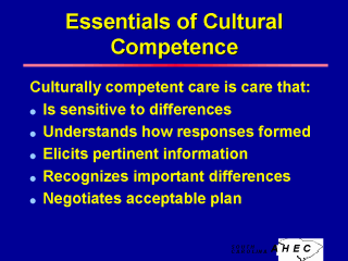 | Essentials of Cultural Competence Culturally competent care is care that: - is sensitive to the differences individuals may have in their experiences and responses due to their heritage, socioeconomic situation, ethnicity, and cultural background. - is based on understanding how those differences may inform the responses of people and the processes of caring for them. - elicits the medically relevant values, beliefs, customs, characteristics, and social norms of the patient. - recognizes the important differences in value and belief systems between patient and provider. - negotiates an acceptable treatment plan for the patient. |