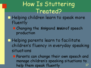 children and parents develop appropriate reactions and healthy attitudes toward stuttering: - We must educate parents about children’s fluency - It is not sufficient to simply tell parents not to worry - they need training about how to react to stuttering |