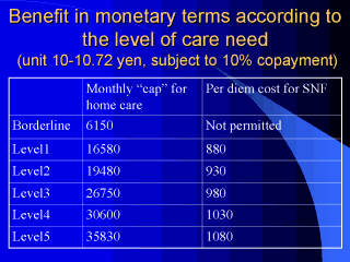 per diem cost for institutional care and the monthly budget cap for home care as shown. The shown figures are relative values. The unit value is between 10 yen to 10.72 yen depending upon the location. For example, skilled nursing facilities in Tokyo, the per diem cost for the level 5 will be: 1080 X 10.72 yen=11578 yen. Recipietns' copayment is 10%. For example, in the above case, the recipient will have to pay 1158 yen and the provider will bill to the insurance 10420 yen. |