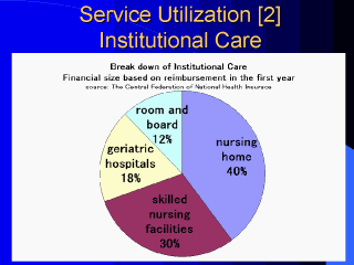 | As for institutional care, the ratio of nursing home, SNF and geriatric hospitals was approximately 4:3:2. The less-than-expected share of geriatric hospitals may be explained by some reluctance of hospitals to convert their beds into the LTCI assignment which would deprive physicians’ discretion of admission orders. |