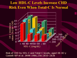 40–49 mg/dL and Total-C > 260 mg/dL. References 1. Castelli WP, Garrison RJ, Wilson PW, et al. Incidence of coronary heart disease and lipoprotein cholesterol levels: the Framingham Study. JAMA. 1986;256:2835–2838. |