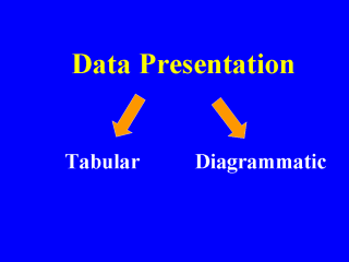 | Data needs to be presented in an appropriate and interpretable way. Data is presented in a tabular (table) or diagrammatic form (graph or chart). Tabular presentation allows for organization of the results into a compact and readily comprehensible form. Diagrammatic presentation gives a better appreciation of the characteristics than tabular presentation. |