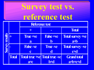 Sensitivity= a/(a+c) - Specificity= d/(b+d) - Predictive value of a positive test (PVT+)= a/(a+b) - Predictive value of a negative test (PVT-)=d/(c+d) - Percentage of correct classification - Bias = (a+b)/(a+c) |