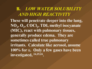 gases. In: Concepts in Inhalation Toxicology. Hemisphere Publishing, NY, p. 229-247, 1989. 25. Kennedy, A. L., Stock, M. F., Alarie, Y. and Brown, W. E. Uptake and distribution of 14C during and following inhalation exposure to radioactive toluene diisocyanate. Toxicol. Appl. Pharmacol. 100, 280-292, 1989. 26. Ferguson, J. S., Kennedy, A. L., Stock, M. F., Brown, W. E. and Alarie, Y. Uptake and distribution of 14C during and following exposure to [14C] methyl isocyanate. Toxicol. Appl. Pharmacol. 94, 104-117, 1988. Note: It is always assumed that these chemicals are so reactive that they never, as such, enter the pulmonary capillaries by diffusion across the alveolar-capillary membranes. I think this is incorrect. |