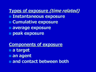 Exposure at any instant in time. Cumulative is the total accumulated dose of exposure in a certain time period. Average is the cumulative divided by total duration of exposure. Peak the highest level of exposure over a given time. Contact boundary for a target. (surface in space containing at least one exposure point) Contact zone of the agent which is the volume of the agent adjoining a contact boundary and concentration. (mass of the agent in a contact zone) Exposure to agents in the environment can be defined as any contact between a potentially harmful agent and a surface of the human body. But because it is rarely feasible to measure the actual contact, we usually use a surrogate to get an approximation of the true exposure level. |