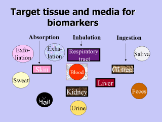 nearby tissues and organs. Blood occupies a central position as a media of transmission of the agent to the body parts and as a target organ. Biomarkers are usually surrogates of available media rather than the target issue, but assuming that these surrogates are true reflections of the target sites. |