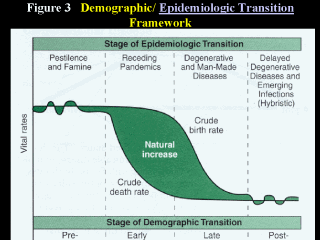Ian R.H. Rockett. Population and Health: An Introduction to Epidemiology. Second edition. Population Reference Bureau 54(4); 1999: 9 The Egyptian-born demographer and health scientist, Abdel Omran, conceived the notion of the epidemiologic transition. Figure 3 reflects a four-stage depiction of the demographic transition and the superimposition of a four-stage epidemiologic transition. Omran’s epidemiologic transition comprised three stages. The additional stage combines the work of other demographers that acknowledges emerging infectious diseases, such as HIV, and the rising mean age at death in the more developed countries attributable to the prevention and improved management of heart disease and stroke. References: Abdel R. Omran. The Epidemiologic Transition: A Theory of the Epidemiology of Population Change. Milbank Memorial Fund Quarterly Vol. XLIX (4); 1971:509-538. S. Jay Olshansky and Brian Ault. The Fourth Stage of the Epidemiologic Transition: The Stage of Delayed Degenerative Diseases. The Milbank Quarterly 64 (3); 1986: 355-391. Richard G. Rodgers and Robert Hackenberg. Extending Epidemiologic Theory: A New Stage. Social Biology 34 (3-4); 1987: 234-243. With appropriate acknowledgement of sources, permission to reproduce freely the three figures presented in this lecture has been granted by the Population Reference Bureau.