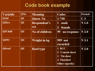 | In formatting N Numeric N1.0 means 1 space width N2.1 means 2 spaces before decimal point and 1 space after decimal point (Note please refer to the software and how it requires the data to be formatted) C Character Reference category -If you know your reference category from before, then make sure it is either the first code or the last code. Eg. The reference category for type of roof is RCC, then code it as 1. RCC and all the other roof types can be in any order Other(specify) will not be coded until you have your data |